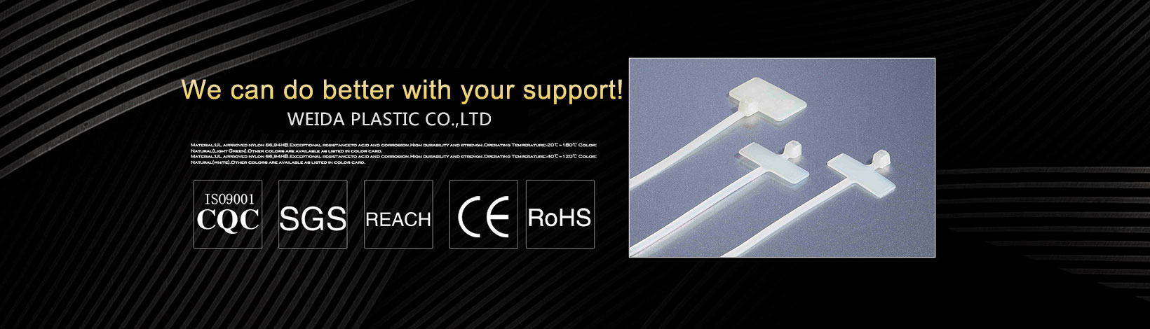 Weida Plastic Co.,Ltd is a professional manufacturer of cable ties and wiring accessories in Wenzhou,China.We specialized in cable ties,self-adhesive tie mounts,expand plugs,close end wire(connector),cable glands,cable clips,cable clamps,tile space,type tie mounts,end cap,spiral wrapping band,marker tube,cable marker,twist ties,heat shrinkable tubings,pvc silicone fiberglass sleeving,etc.